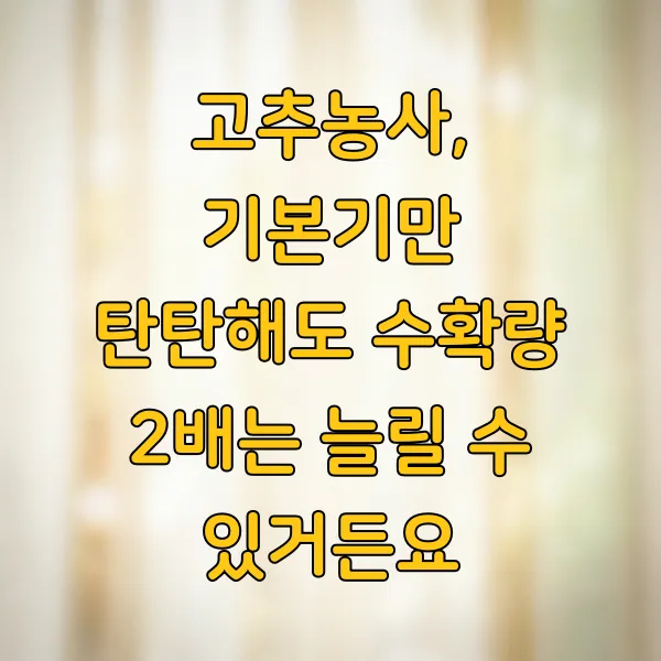 고추 농사가 결코 쉽지만은 않지만, 이렇게 기본기만 잘 다져나가도 분명 달라진 수확량을 경험할 수 있을 거예요. 여러분의 땀과 정성이 맛있는 고추로 돌아오길 응원합니다.면책 조항: 본 콘텐츠는 일반적인 고추 재배 방법에 대한 정보 제공을 목적으로 하며, 특정 농법이나 비법을 보장하지 않습니다. 농작물 재배 결과는 지역별 토양, 기후, 품종, 관리 방법 등 다양한 요인에 따라 달라질 수 있습니다. 모든 재배 활동은 농민의 경험과 판단에 따라 신중하게 진행해야 합니다.